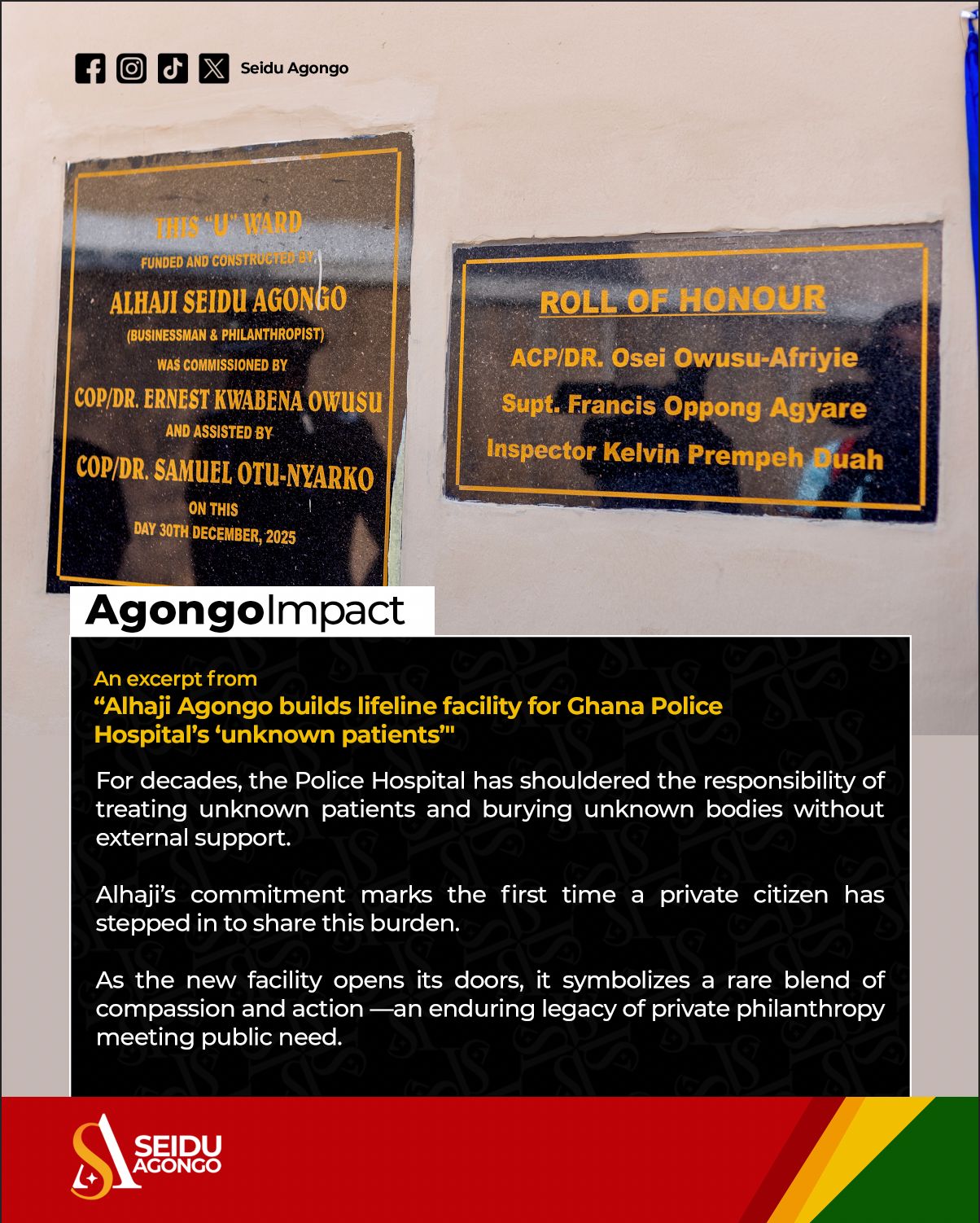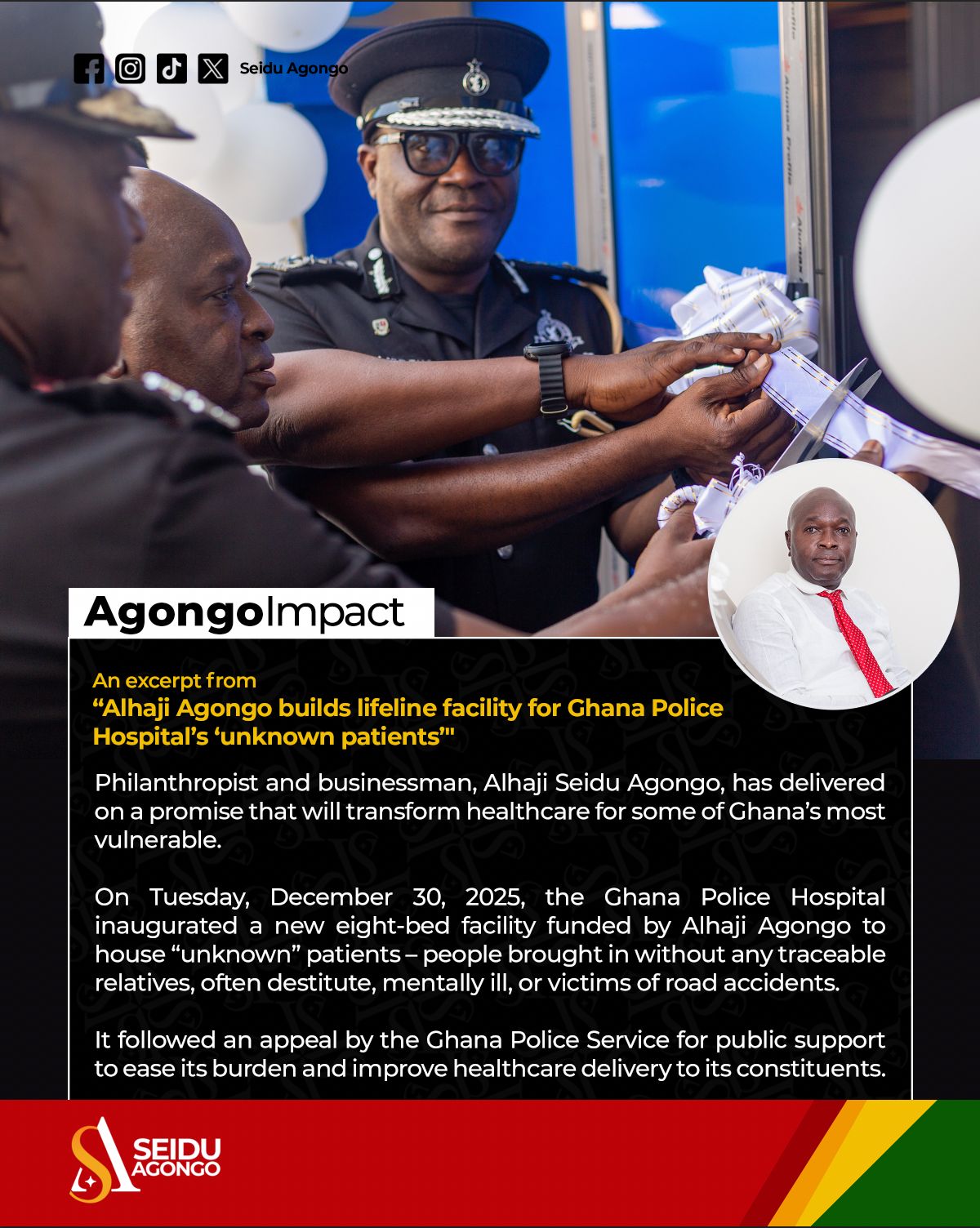 On Tuesday, December 30, 2025, the Ghana Police Hospital inaugurated a new eight-bed facility funded by Alhaji Agongo to house “unknown” patients – people brought in without any traceable relatives, often destitute, mentally ill, or victims of road accidents.