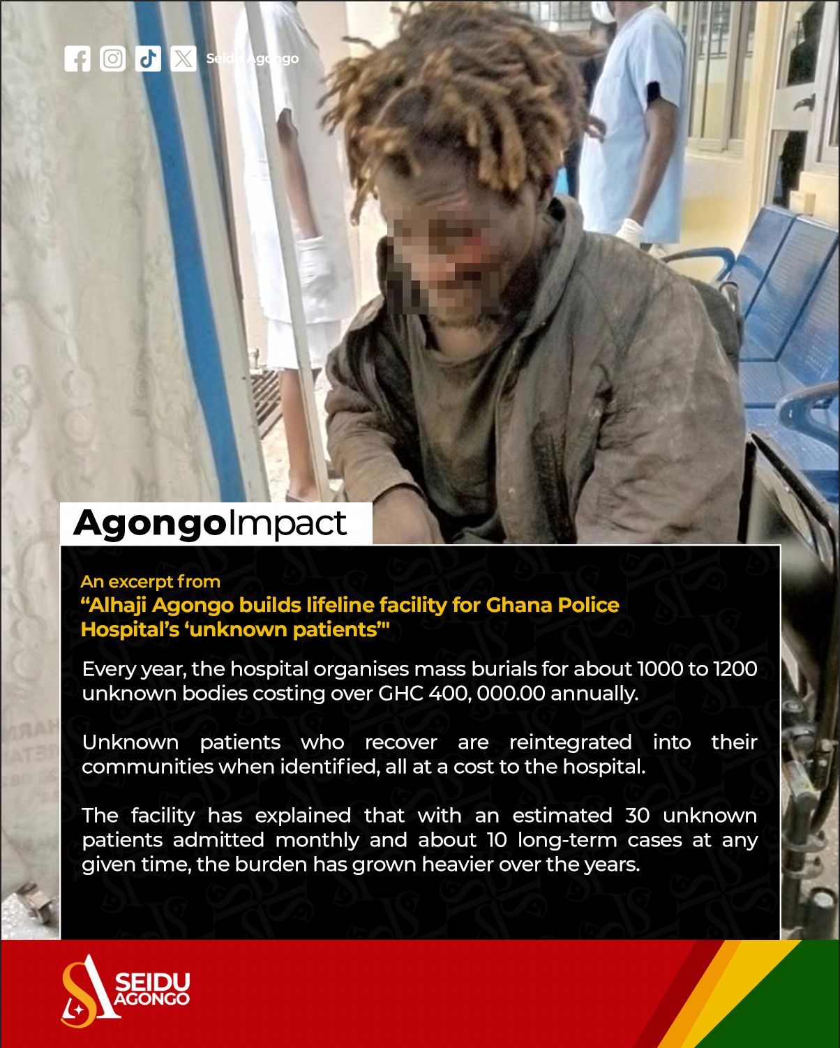 The hospital has said that these individuals arrive in critical condition, nameless and abandoned, and the hospital bears the full cost of their treatment and rehabilitation costing over a million cedis per year.