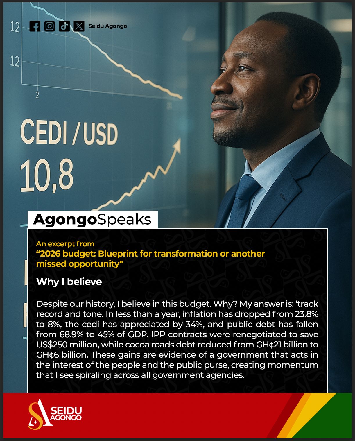 The writer believes that execution demands speed, accountability, and collaboration. He cites the government’s track record, including inflation down from 23.8% to 8%, the cedi appreciating by 34%, and public debt slashed from 68.9% to 45% of GDP, as evidence of a government that acts in the interest of the people and the public purse.