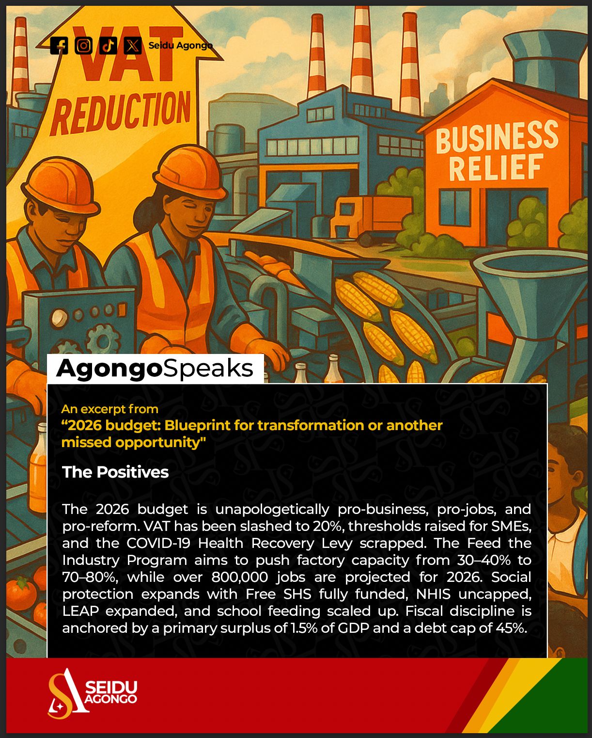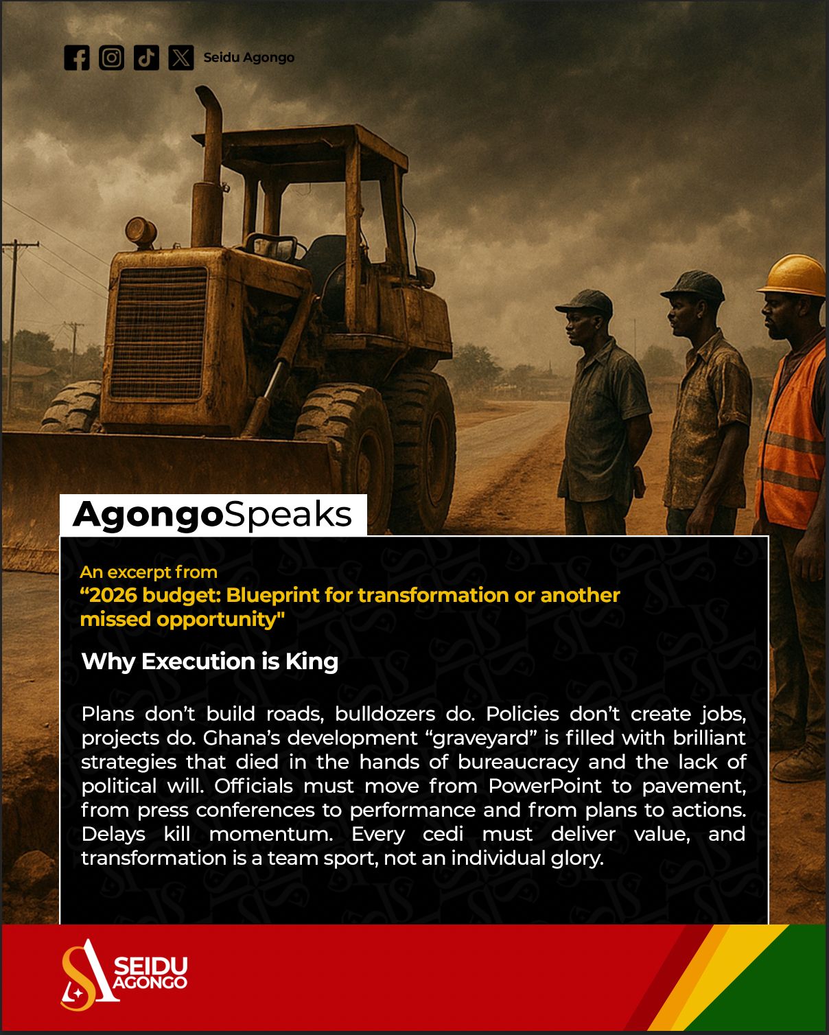 The budget offers several positives, including tax reliefs, industrial push, job creation, social protection, and fiscal discipline anchored in law. However, the writer, Seidu Agongo, a businessman and philanthropist, cautions that plans don’t build roads, bulldozers do, and policies don’t create jobs, projects do.